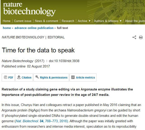 《自然-生物技术》8月3日同时发表了题为《是该数据说话的时候了》的社论。文中称,一项宣称通过Argonaute酶实现基因编辑的研究被撤回,这显示了论文发表后的同行评议在全天候媒体时代的重要性。社论梳理了这篇论文发表以来的事件进展:本期,韩春雨及同事撤回了发表于去年5月的一篇论文。该论文称,短5′磷酸化单链DNA可引导格氏嗜盐碱杆菌核酸内切酶(NgAgo)产生双链断裂,实现对人类基因组的编辑。论文一发表,便引起科研人员的极大兴趣和媒体的竞相报道。但是很快,在推特、博客和其它社交媒体的助燃之下,有关该研究可重复性的质疑开始迅速增多。去年11月,发表了“编辑部关注”,提醒科研界留意这些可重复性方面的担忧。为了最终解决这个争议,多个研究小组在数月里生成了更多的实验数据。如今尘埃落定,这也是世界各地的许多实验室为澄清NgAgo的功能而付出的大量时间、精力和资金的证明。