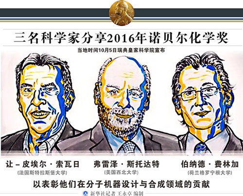瑞典皇家科学院10月5日宣布,将2016年诺贝尔化学奖授予让-皮埃尔·索瓦日、弗雷泽·斯托达特、伯纳德·费林加这三位科学家,以表彰他们在分子机器设计与合成领域的贡献。