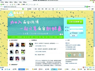 “南审有自己的微博啦!”3月19日晚上南审微博正式“对外开放”的第一天,南审的新鲜人士就立马火速去抢着注册,服务器最高时被2000多人“踩踏”。从晚9点到12点断网前,有近300人注册成功。“脖友”们的处女秀也都一点不羞涩,名叫小浪的脖友织的第一条围脖是:“本来就有很严重的围脖、校内、豆瓣刷新强迫症,现在又多了一个地方,内牛满面啊!”