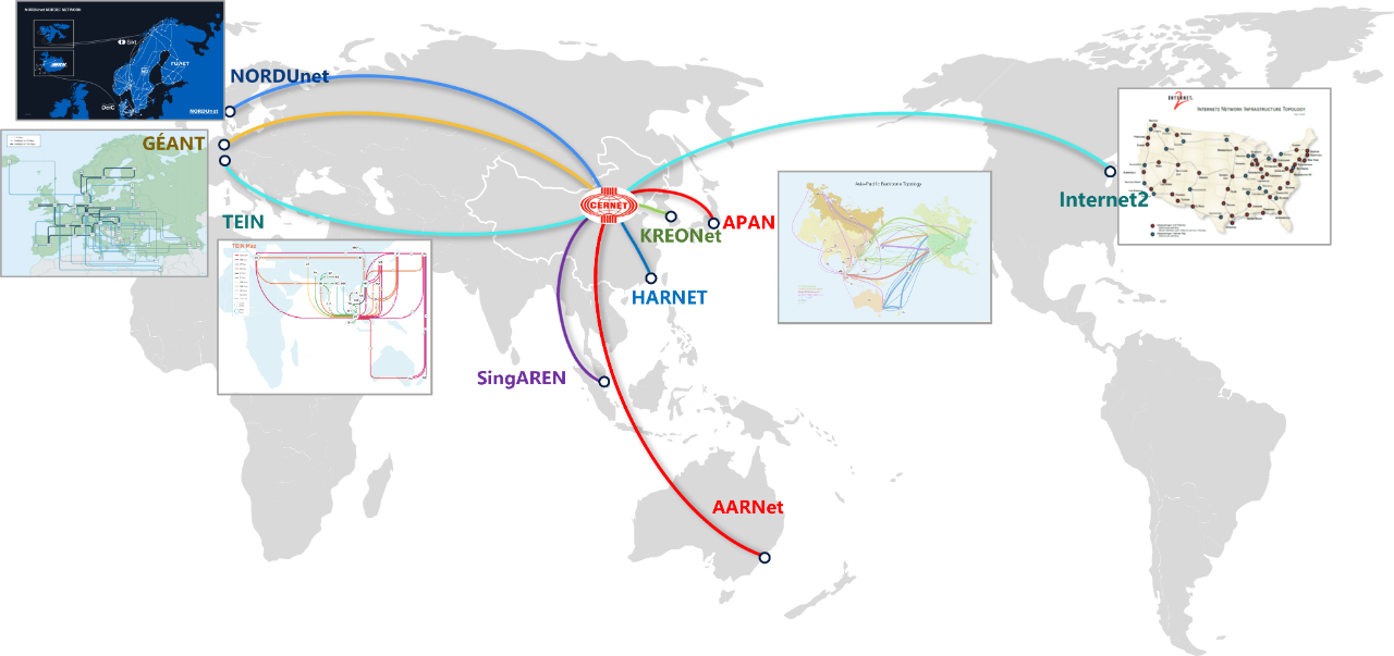 截至目前,CERNET已经实现与美国Internet2、欧洲GéANT、跨欧亚TEIN、亚太地区APAN等国际学术网络互联互通。CERNET作为国家级学术网络,将持续加强全球各国教科网之间高速、安全的互联互通,推动全球数字教育网络服务和教育资源的合作共享,构建全球数字教育发展共同体。