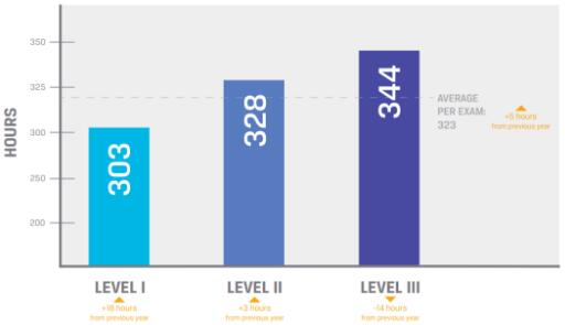 根据CFA协会官网统计的候选人报告的数据显示,2019年6月CFA一级考生平均投入的备考时长为303小时,CFA二级考生平均投入的备考时长为328小时,CFA三级考生平均投入的备考时长为344小时。备考时间的数据仅供参考,考友在制定备考规划时,也应考虑到个人的基础水平以及备考效率、可投入的备考时间等因素。