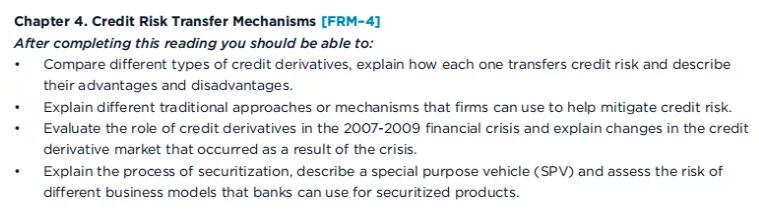 考纲变化:删除了两个章节,即lassifications and Key Concepts of Credit Risk和Default Probabilities,Credit Spreads, and Funding Costs,新增银行资本结构章节。其他部分章节的考点要求有做微调。