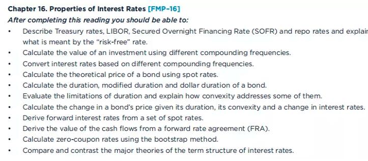 总体来看,16章的考点在去年考纲中均未提及,但是内容其实是债券的基础知识,考点主要集中在利率的性质,并解释了债券的估值,期限和凸度,远期利率协议的定价以及期限结构的理论。