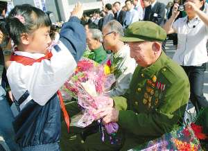 图②:9月18日,位于长春伪满皇宫博物院的东北沦陷史陈列馆开馆,小学生向老兵送上鲜花。 李 磊摄