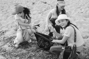 资料照片:2007年4月14日,志愿者在博鳌海滨拾垃圾。此前,参加这一活动的80多名志愿者,每人多背一公斤学习用品送给博鳌联珠小学的贫困学童。(蒙钟德 摄)