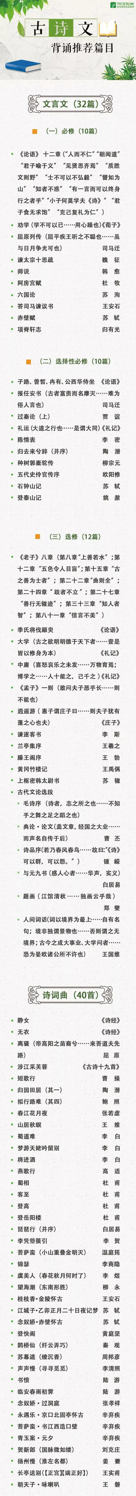 普通高中古诗文背诵推荐篇目增至72篇 全名单公布