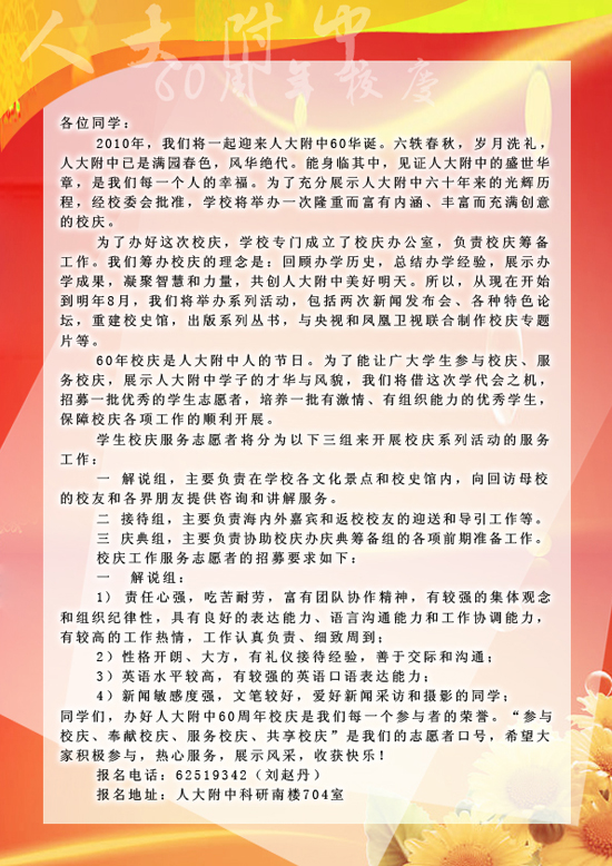 当前位置:首页 > 中国教育 > 基础教育 > 基教专题 > 人大附中校庆 > 活动公告