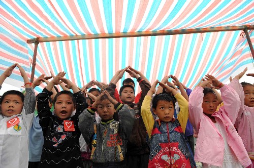5月29日,四川省什邡市洛水镇的孩子们在为迎接“六一”儿童节排练节目。经历汶川地震的孩子们,面对灾难,他们选择了坚强与希望。新华社记者 王晔彪 摄