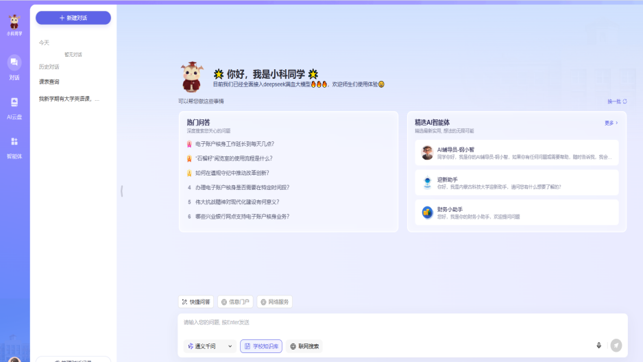 今年,内蒙古科技大学的“小科同学”也迎来了2.0版本,在本次迎新过程中发挥了不小的作用。“小科同学”共有18个智能区,涵盖了教务、财务、行政办公等多个方面,能够自动回复师生各类生活与学习问题,并且可自动抓取学校规章制度、办事流程、通知公告等信息,生成“校本知识库”。迎新期间还专门构建了迎新智能体,更贴心服务新生。自上线以来,“小科同学”已累计服务师生近1.8万人次。