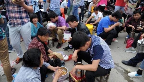 某知名中学的陪读家长给子女送热乎的饭菜。