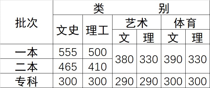 高职专科批次:文史类300分,理工类300分,艺术(文)290分;艺术(理)290分,体育(文)300分;体育(理)300分。