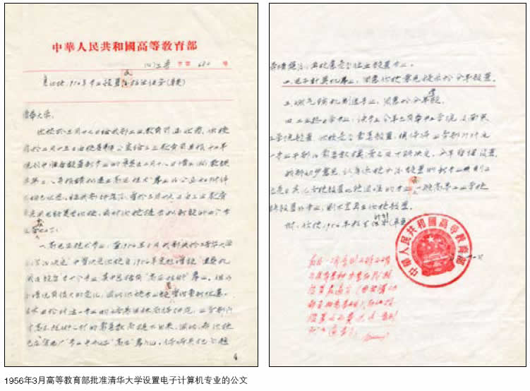 清华大学计算机科学与技术系是由前自动控制系和工程力学数学系计算数学专业的一部分组建而成。其筹建工作始于1955年初,毛主席、党中央决定独立发展我国的原子能事业,为配合这方面的人才需要,是年10月,清华大学增设十个新专业,其中包括在电机工程系增设“远距离机械及电气自动装置”,后来正式命名为“自动学远动学”专业。次年,清华大学决定增设新的专业,其中包括电子计算机专业。2月25日,清华大学向高等教育部报请申报1956年增设新专业的计划,3月31日,高等教育部以(56)工曾字682号文件正式批复:“电子计算机专业:同意你校意见提前于今年设置。”