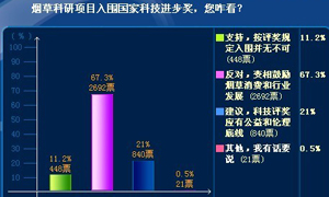 科技部网站公示将授予“中式卷烟特征理论体系构建及应用”以国家科学技术进步奖。目前该奖项还处于公示期间,为期四十天。消息一经传出,迅速引发了国内控烟人士的强烈反弹,控烟人士纷纷对此表示质疑。该奖项的推荐单位是国家烟草专卖局。据称,该研究成果的应用,“提升了产品质量和市场适应性,近三年累计实现新增销售收入1735.74亿元,新增利税1421.8043亿元”,到底烟草研究入围这个奖项是否合理,希各位网友发表言论。 |