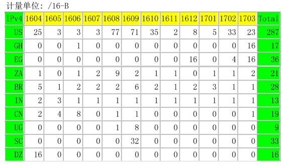 3月全球IPv4地址分配数量为68B,其中获得最多的是美国,23B;其次是加纳和埃及,均为16B。3月,除亚太、欧洲、拉美、北美等地区IPv4地址已耗尽外,非洲地区则分配如常。各地区IPv4地址消耗情况,参见表1。在过去的12个月,美国获得的IPv4地址最多,共计287B;其次是埃及,36B。