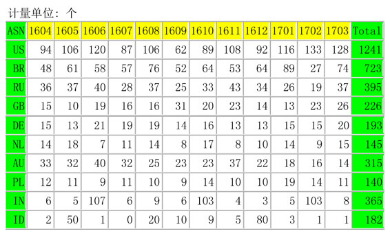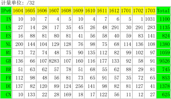 3月全球IPv6地址申请(/32以上),总计有405个,其中欧洲163个,拉美115个,亚太90个,北美32个,非洲5个,分别来自65个国家/地区。申请个数最多的是巴西,81个;其次是美国,28个。3月较大的申请,有一个/22来自印度,一个/24来自美国。3月全球IPv6地址分配数量为2575*/32,其中分配地址数量最多的是印度,1031*/32;其次是美国,283*/32。在过去的12个月,获得的IPv6地址数量最多的是英国,9526*/32;其次是荷兰,1380*/32。