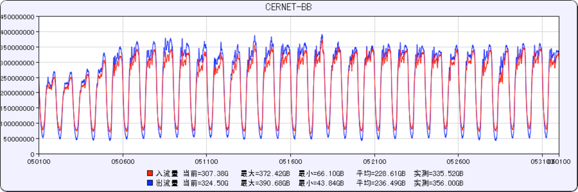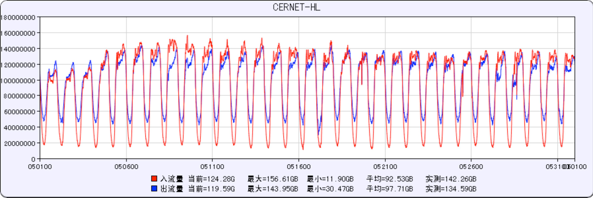 2019年5月CERNET主干网网络运行正常。5月CERNET主干网流量相比于4月基本稳定,主要原因是高校用网稳定。从主干网的流入、流出流量来看,相比于4月入流量增加了14.35 G,出流量增加了2.04 G;从国内互联流入/流出来看,相比于4月入流量减少了3.88 G,出流量增加了0.63 G;从国际互联流入/流出流量来看,相比于4月入流量减少了0.82G,出流量增加了0.22G。从CERNET主干网流量对比来看,全国十大地区入方向流量清华居首,华中地区次之,北邮第三;出方向流量华中地区第一,清华第二,华东南地区和东北地区并列第三位。