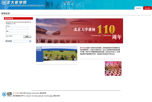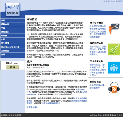 依托Blackboard教育软件8.0版本构建,集网络教学、数字资源管理、在线视频课堂和校园社区诸功能为一体的综合性网络平台——“北大教学网”(http://course.pku.edu.cn/ )已于近日建成并迅速运转起来。