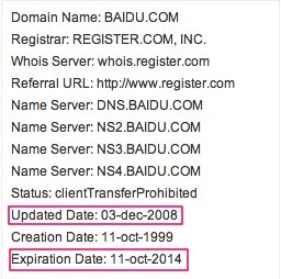 这件事情其实并不是外界所说的,百度的域名到期。要印证这个说法,很简单。国内知名的域名注册商万网的whois查询程序有一个缓存,具体缓存多长时间我不知道,但肯定不短。通过这个机制,我们可以查看百度出事前的whois缓存,baidu.com最后修改的时间是2008年12月3号,到期日期是2014年8月11号。而出事后最后修改的时间是2010年的1月11号(非CST)。