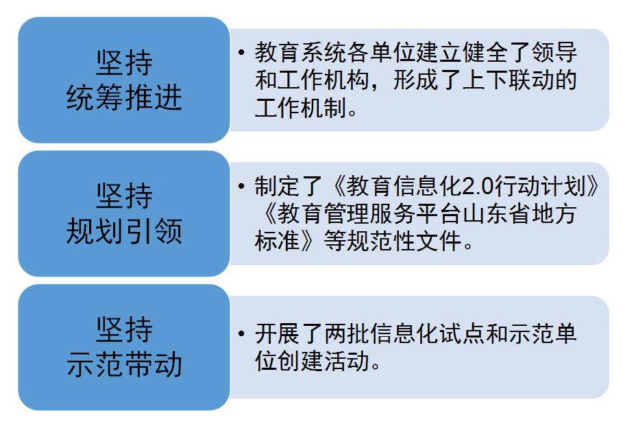 十三五期间,山东省认真贯彻落实教育部和省委省政府有关教育信息化工作部署,在工作中做到“三个坚持、三个强化”。