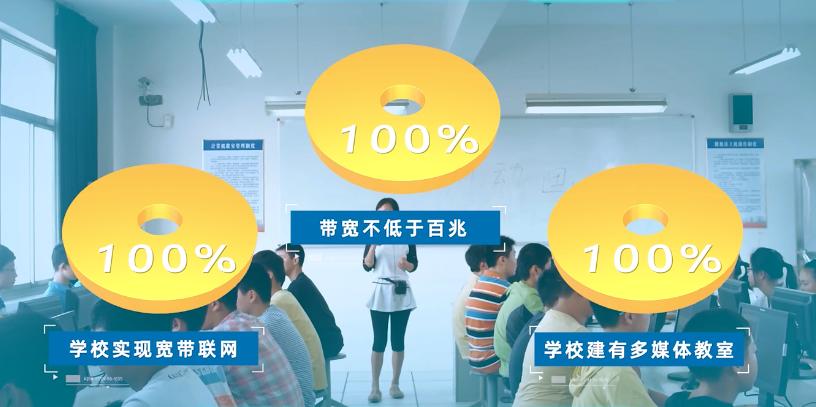 中小学校实现3个“百分之百”,即100%的学校实现宽带联网、100%的联网带宽不低于百兆、100%的学校建有多媒体教室;多媒体教室占所有教室比例达98.2%,数字校园覆盖比例达93.8%;每百名学生拥有终端11.2台,教师人均拥有终端1.1台。高等学校数字校园覆盖比例100%,无线校园覆盖比例83.2%,互联网出口校均7.4G。