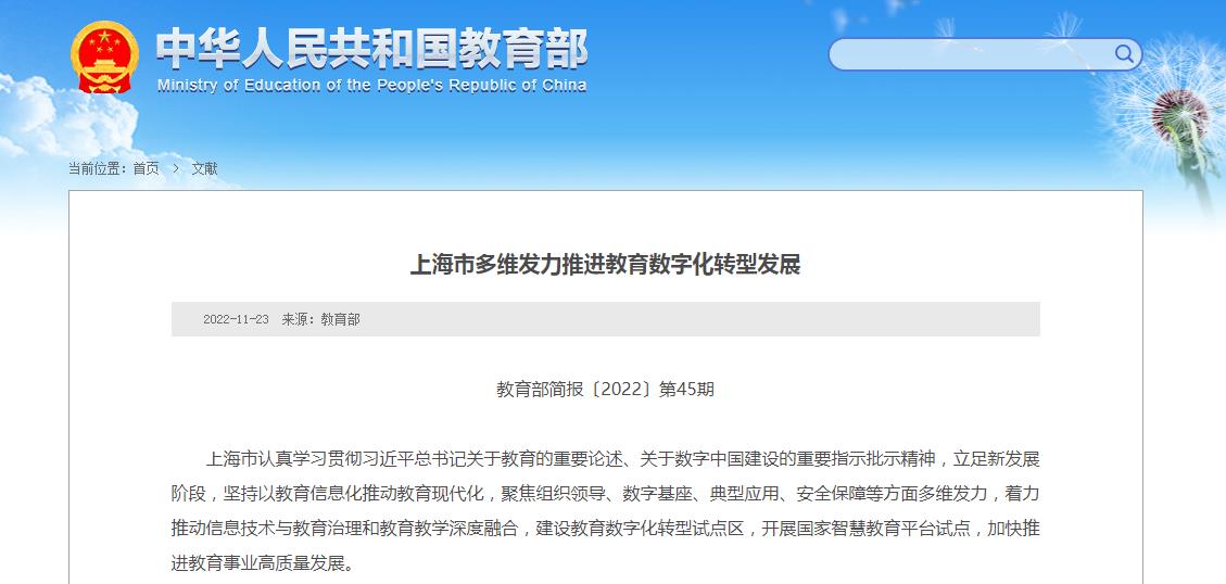 上海市认真学习贯彻习近平总书记关于教育的重要论述、关于数字中国建设的重要指示批示精神,立足新发展阶段,坚持以教育信息化推动教育现代化,聚焦组织领导、数字基座、典型应用、安全保障等方面多维发力,着力推动信息技术与教育治理和教育教学深度融合,建设教育数字化转型试点区,开展国家智慧教育平台试点,加快推进教育事业高质量发展。
