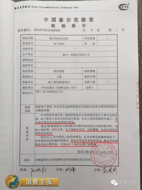 此前,央视《消费主张》栏目曾陪同遭遇国行版Note7手机爆炸的两位消费者张思童和回仁杰,前往中国最权威的检测机构之一----泰尔实验室,对他们购买后发生了爆炸的Note7手机进行检测。经过数天的燃损原因分析,泰尔实验室得出了最终结论:张思童的手机“因烧损严重,无法推定起火原因”,而回仁杰的手机“样品未发现外部加热痕迹,样品的热损毁由电池自燃所致,电池由右下角的位置开始燃烧。”