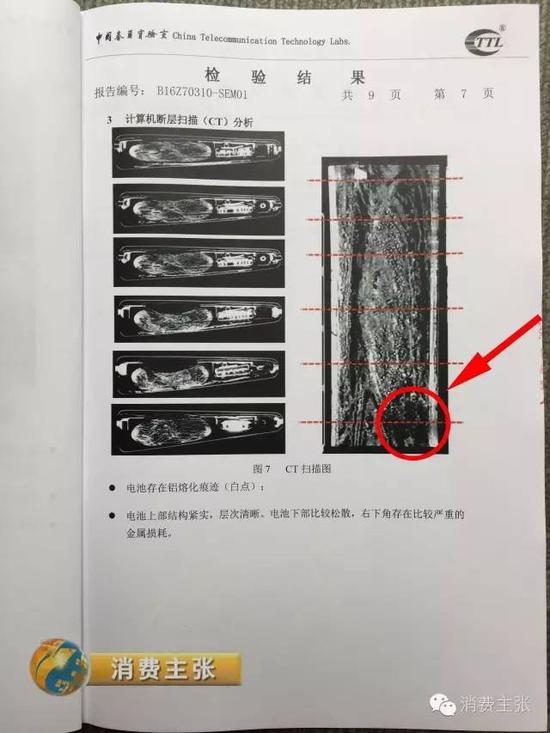 中国泰尔实验室环境与安全部主任巫彤宁告诉记者,他们的专家小组对这次两位消费者送检的手机进行仔细分析后发现,这台来自辽宁消费者张思童的三星Note7手机因烧损严重,无法推定起火原因。而这台来自广州消费者回仁杰的三星Note7手机,在外观上“未发现外部加热引起热损毁的痕迹”,又通过X射线成像及计算机断层扫描对电池进行内部结构分析,“发现电池右下角缺失明显,边际模糊。电池内部存在铝熔化的痕迹。”