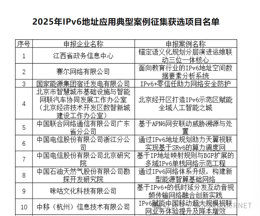 2025年IPv6地址应用典型案例征集活动,是为深入贯彻落实我国《2025年深入推进IPv6规模部署和应用工作要点》,进一步促进IPv6技术创新与融合应用,在工业和信息化部信息通信管理局的指导下,由中国互联网络信息中心组织开展。案例评选从应用效果、创新性、技术性、社会效益等维度进行评价,最终有78个项目入选典型案例。