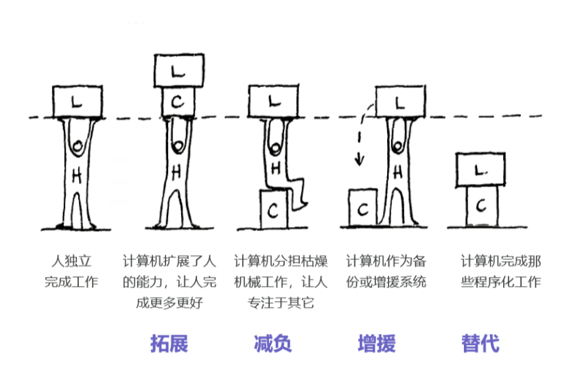 至于人工智能在高等教育中未来应用前景,可以参考上图所示,这是麻省理工学院(MIT)在20世纪70年代发表的一篇研究水下机器人研究报告中的一张图,生动地诠释了计算机协助人类完成工作的程度差异:从人独立完成工作,到计算机扩展人的能力,到分担枯燥机械类工作,到作为备份或增援系统,直至机器独立完成程序化工作。相信未来会出现越来越多的人工智能教学应用,从上述四个方面增强教师的教学效能和学生的学习效果。