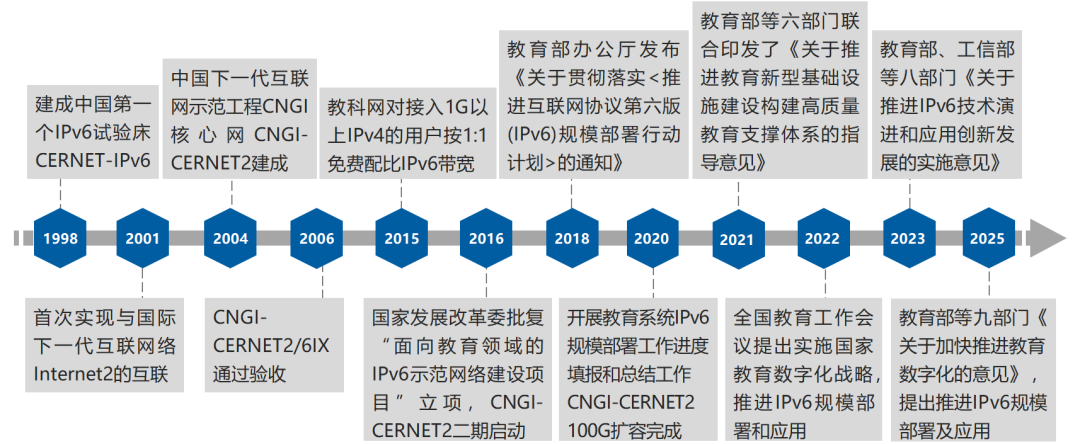 2021年7月,教育部等六部门发布《关于推进教育新型基础设施建设构建高质量教育支撑体系的指导意见》,提出深入推进IPv6等新一代网络技术的规模部署和应用。