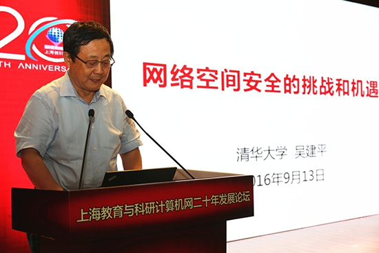 吴建平院士代表中国教育和科研计算机网CERNET向上海教科网开通20周年表示祝贺,并以“网络空间安全的挑战和机遇”为题发表演讲。吴院士从网络空间基本内涵和起源说起,分析了网络空间安全面临的主要挑战,介绍了互联网基础设施的安全威胁,提出了对发展网络空间安全的若干思考。作为国务院网络空间安全一级学科评议组负责人之一,吴建平还介绍了“网络空间安全”一级学科的概况及设置的必要性并强调,当前要充分提高网络空间安全认识,牢牢把握网络空间安全发展的基础研究和核心技术攻关,抓住IPv6下一代互联网发展的机遇,实现跨越式发展;通过军民融合发展战略,加强网络空间安全人才的培养。