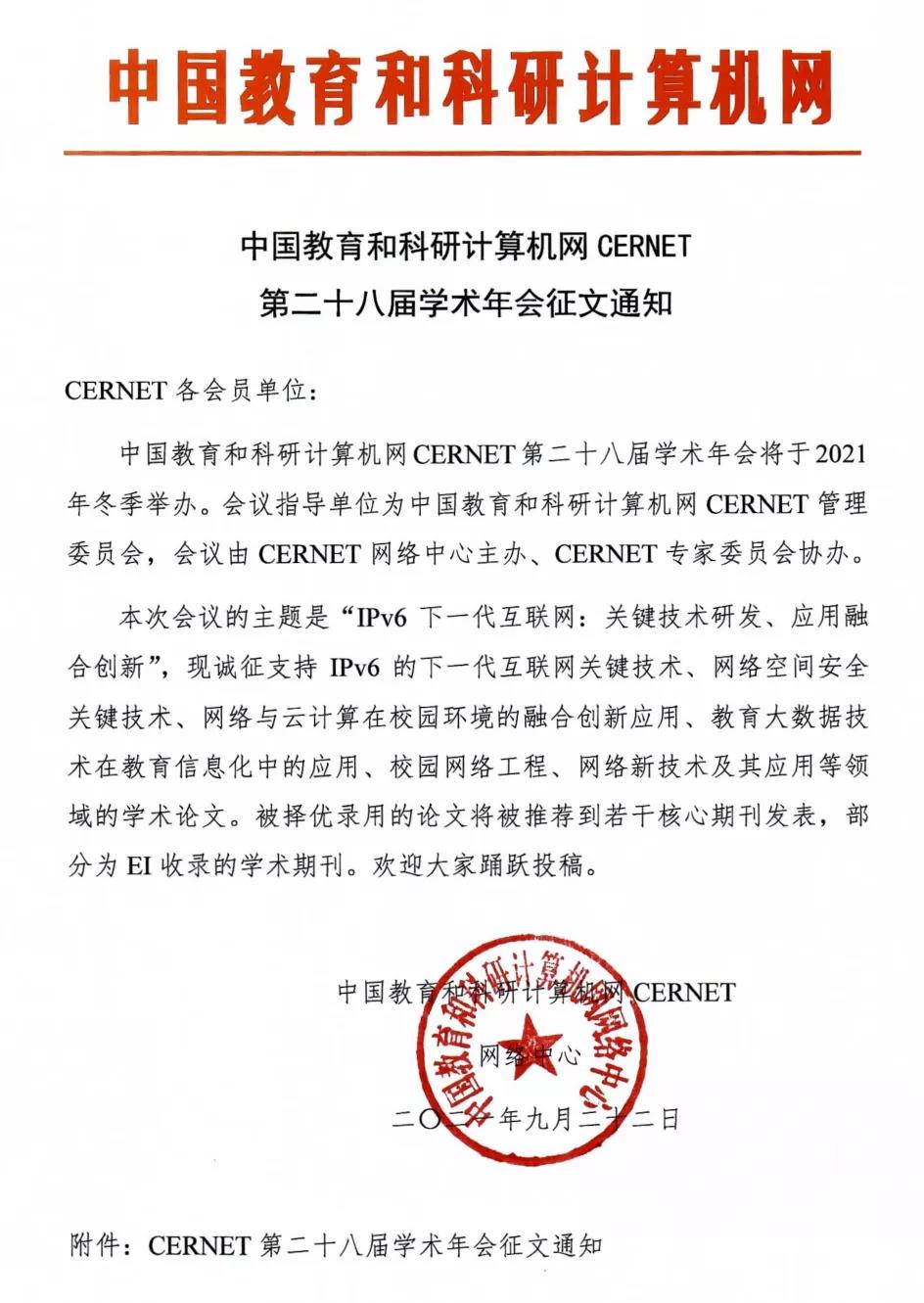 中国教育和科研计算机网CERNET第二十八届学术年会将于2021年冬季举办。