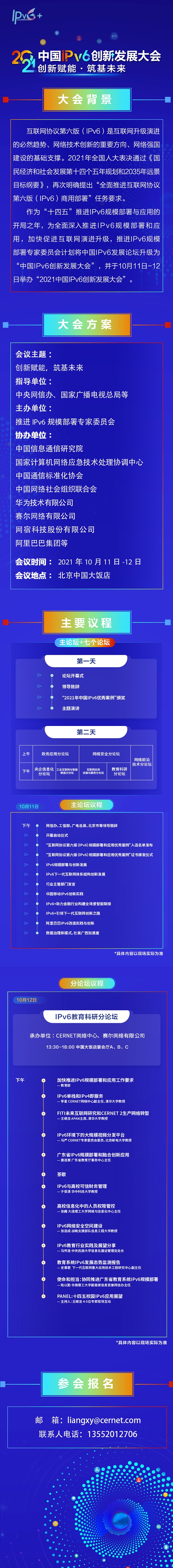 为全面贯彻落实“十四五”新时期IPv6规模部署与应用工作,深入推进教育领域IPv6核心技术研究、规模部署和应用创新,加快促进高校互联网演进升级,作为2021中国IPv6创新发展大会重要分论坛之一,教育科研论坛将于2021年10月12日在北京举行。论坛以“IPv6教育科研新担当”为主题,由中国教育和科研计算机网CERNET网络中心、赛尔网络有限公司承办。
