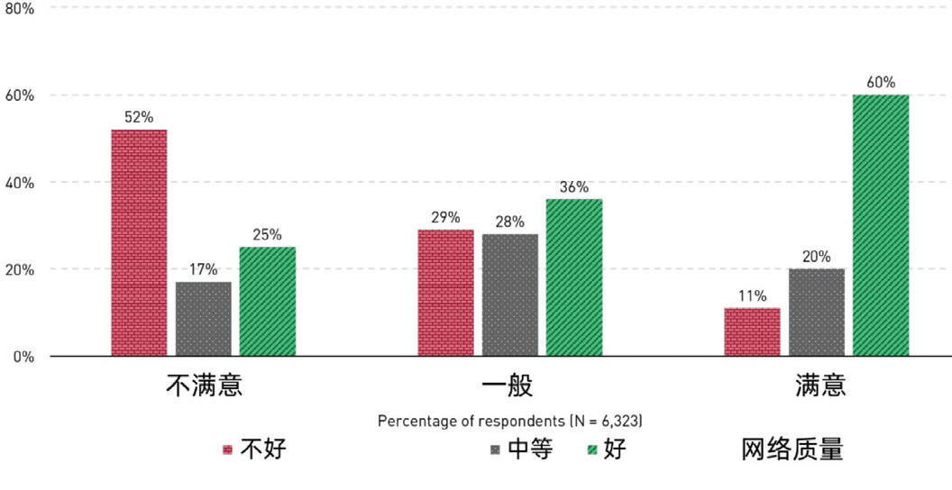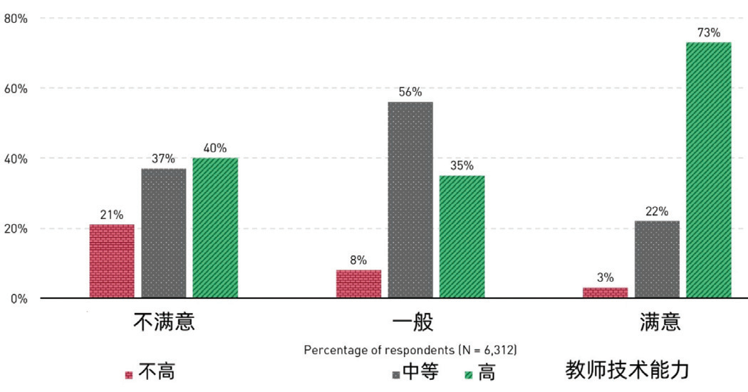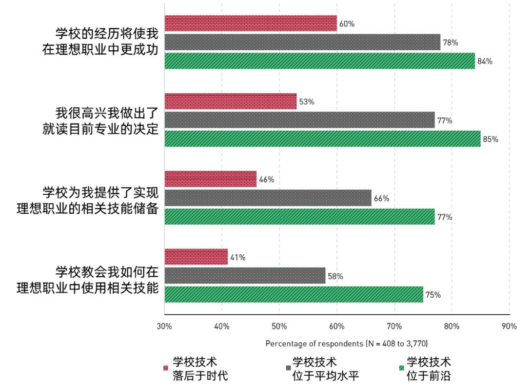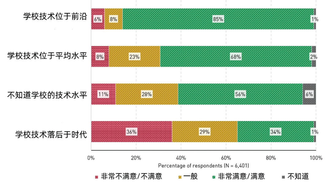 大多数学生(69%)对他们所在学校的技术服务和支持表示满意,但更多(72%)学生认为其学校在使用技术增强学习体验方面表现一般。值得注意的是,认为学校处于技术前沿的学生,对技术服务满意度(85%)明显高于学校技术水平一般(68%)或落后(34%)的学生(如图 1)。