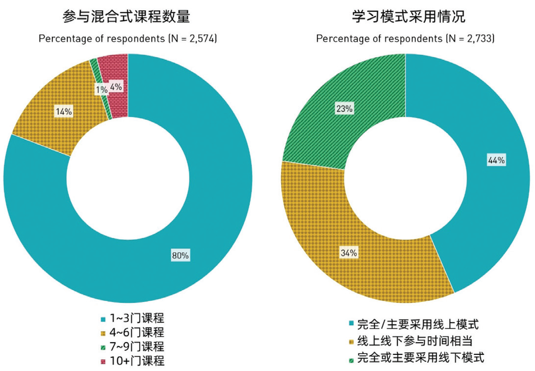 报告显示,大多数受访者(48%)表示入学后从未参与过混合式课程,46%的学生有过相关体验。尽管参与混合式课程的学生数量比前两年略有增长,但学生对该模式的体验仍然有限。在参与过混合式课程的学生中,绝大多数(80%)仅体验过1~3门该类课程,14%参与过4~6门,1%参与过7~9门,4%参与过10门及以上(如图 3)。参与混合式课程的学生中,44%主要或完全采用在线方式学习,34%表示线上线下参与时间相当,23%主要或完全选择线下参与。数据表明,虽然学生会参与混合式课程,但大多数并未将其作为主要学习模式。
