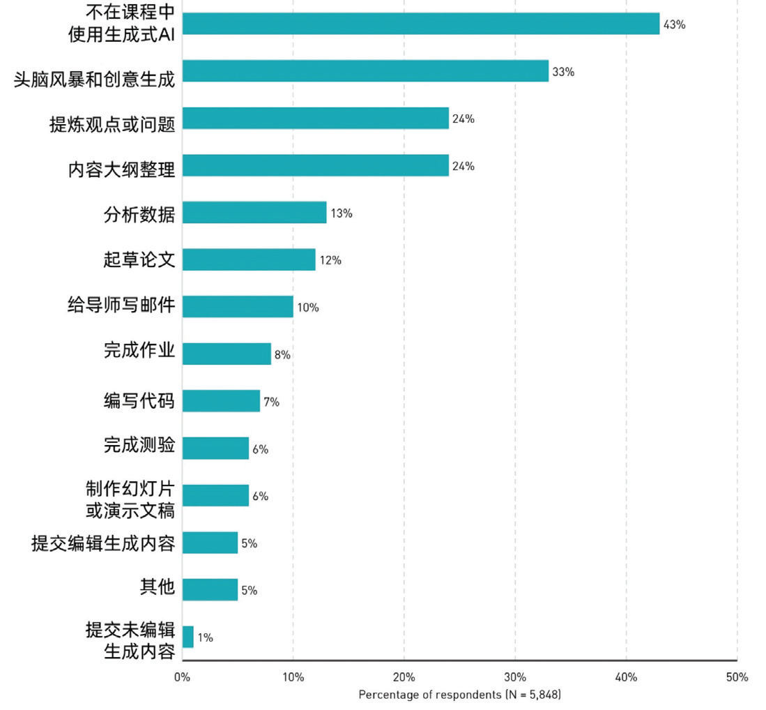 数据显示,学生在课程中使用生成式AI的情况较为有限。 43%的学生表示完全未使用生成式AI(如图4)。对于使用AI的学生,最常见的三大用途是:头脑风暴与创意生成(33%)、提炼观点或问题(24%)以及内容大纲整理(24%)。