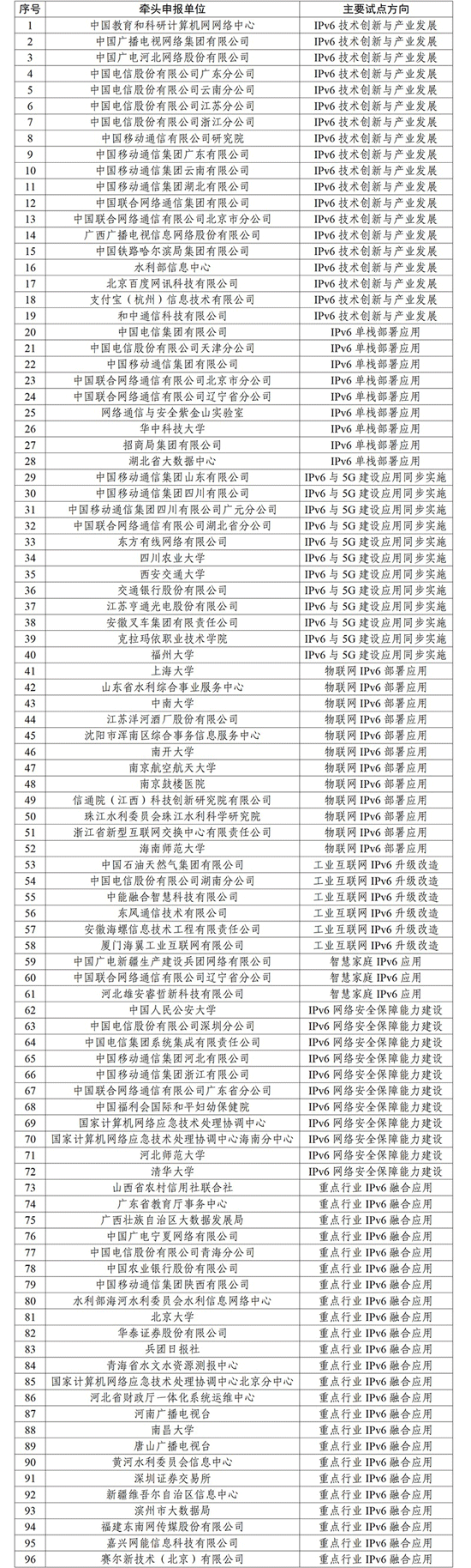 近日,中央网信办秘书局、国家发展改革委办公厅、工业和信息化部办公厅、教育部办公厅、科技部办公厅、公安部办公厅、财政部办公厅、住房和城乡建设部办公厅、水利部办公厅、中国人民银行办公厅、国务院国资委办公厅、广电总局办公厅联合印发通知,确定IPv6技术创新和融合应用试点名单。通知指出,经地方和相关部门组织推荐、专家评审及复核、网上公示等程序,确定了22个综合试点城市和96个试点项目。