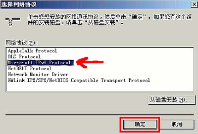 4.选中“协议”,点击“添加”,选中“Microsoft IPv6 Protocol”,再点击“确定”键;