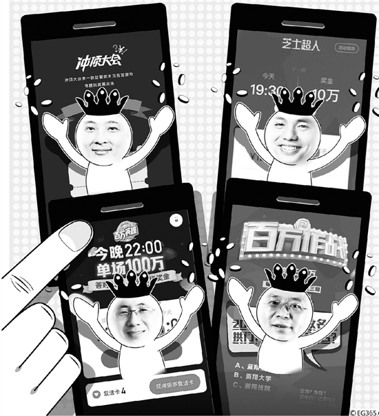 “我撒币、我乐意”——1月3日,王思聪在他30岁生日的当晚9点拿10万元给《冲顶大会》作为奖金,吸引28万人在线参与。西瓜视频的“百万英雄”、映客旗下的“芝士超人”、花椒的“百万作战”1月6日同时投放了百万级别单场奖金,其他各平台也不甘落后,又相继推出200万元、300万元甚至400万元单场奖金。从开始的单场3万元、5万元奖金,到现在单场百万元,各大平台争相砸钱入场。