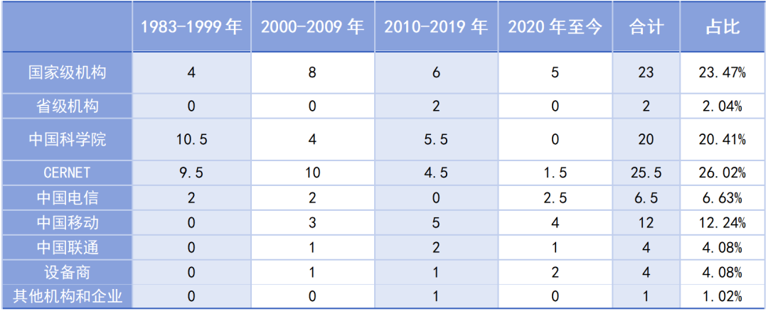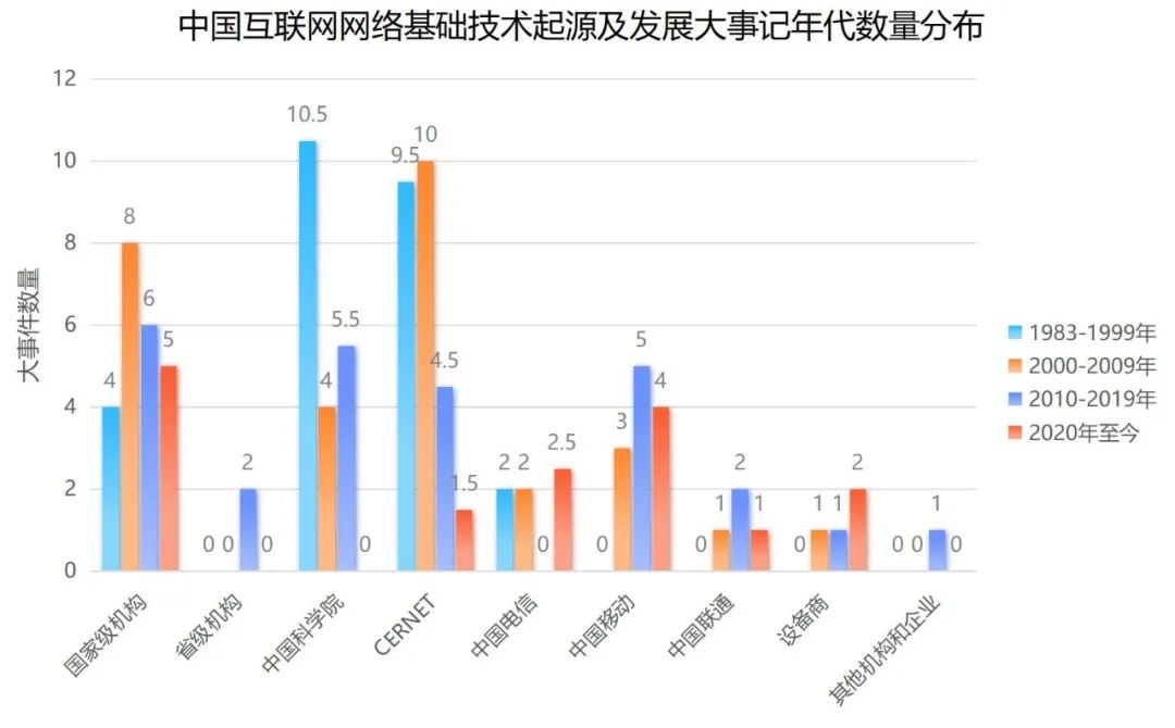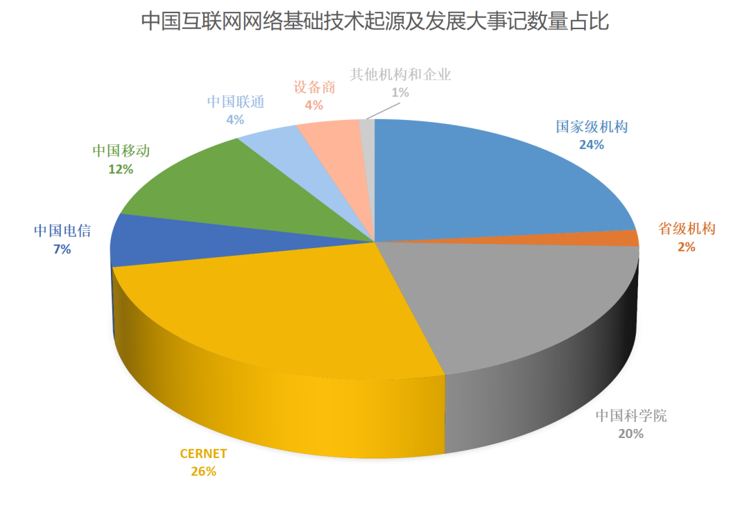 从贡献单位来看,国家级机构有23项、省级机构有2项、中国科学院有20项、CERNET25.5项、中国电信6.5项、中国移动12项、中国联通4项、设备商4项、其他机构和企业1项(计算方式:同一项目数量统计合计为1项,除以合作单位数量的结果为此项得分。另中国互联网络信息中心CNNIC 2014年前相关事件归类于中科院,2014年后相关事件归类于国家级机构)。