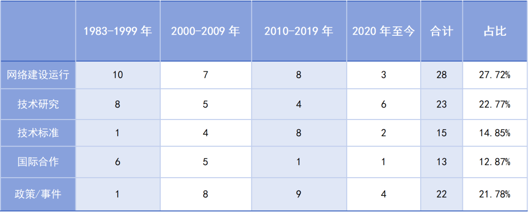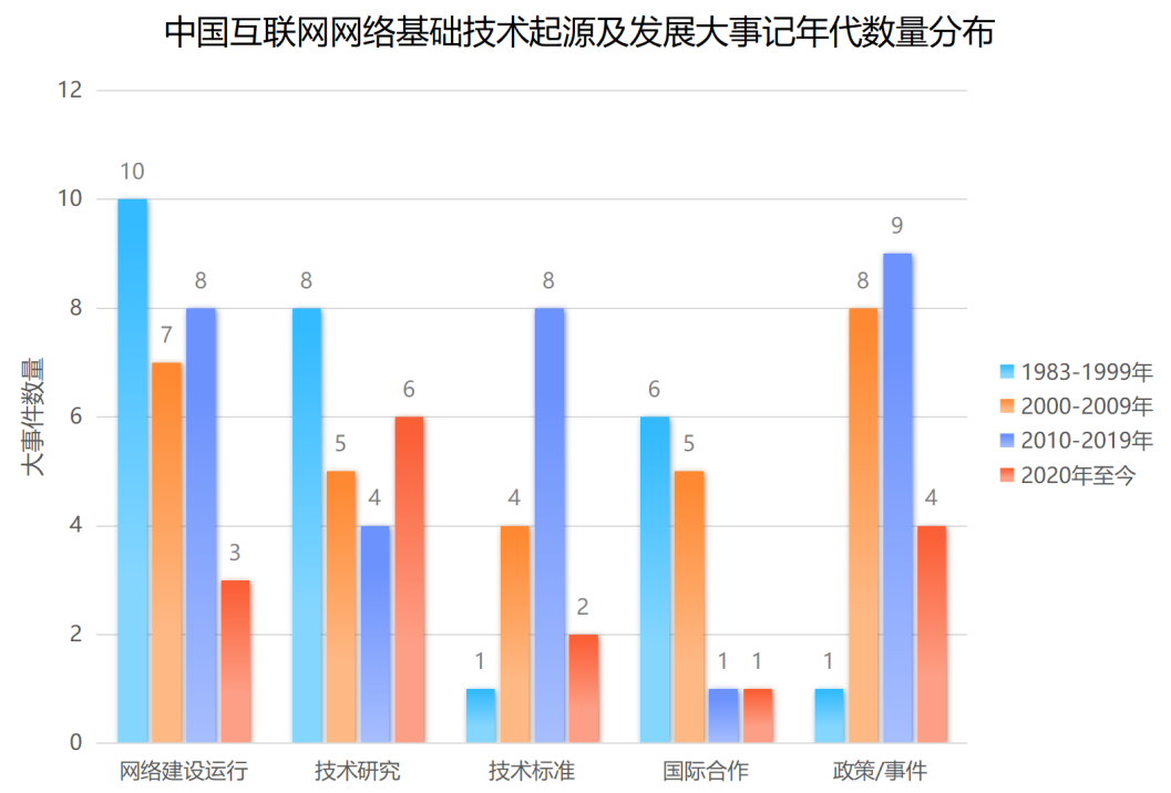 从各大类别来看,网络建设和运行28项、技术研究23项、技术标准15项、国际合作13项、政策/标志性事件22项(计算方式:只要涉及相关类别都在类别中各算一项,因此可能有事件会重复统计,总体来看,此项有3项内容分别在两个类别中统计)。