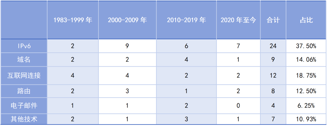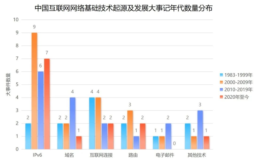 单纯从技术层面(选取与技术相关的62项)来看,IPv6相关大事有24项、域名相关9项、互联网连接12项、路由相关8项、电子邮件相关4项、其他技术相关7项(计算方式:只要涉及相关类别都在类别中各算一项,因此可能有事件会重复统计,总体来看,此项有2项内容分别在两个类别统计)。