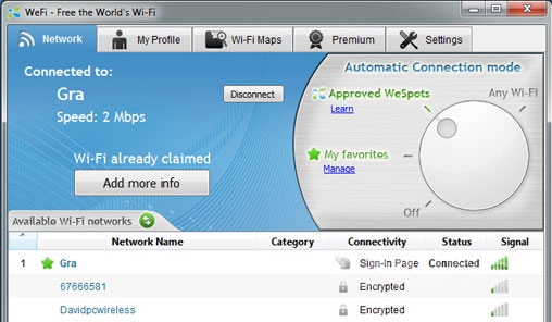 WeFi还能帮助你完成接入热点的任务。比如说,它可以自动地只连接到你偏爱的一些热点或者只连接到已被其他WeFi成员所发现的热点。
