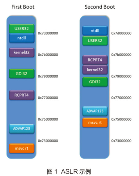 Address Space Layout Randomization(ASLR)是什么?一些攻击,比如returnorientedprogramming(ROP)之类的代码复用攻击,会试图得到被攻击者的内存布局信息。这样就可以知道代码或者数据放在哪里,来定位并进行攻击。比如可以找到ROP里面的gadget。而ASLR让这些内存区域随机分布,来提高攻击者成功难度,让他们只能通过猜测来进行不断试错的攻击(理想状况下),图1为ASLR示例。
