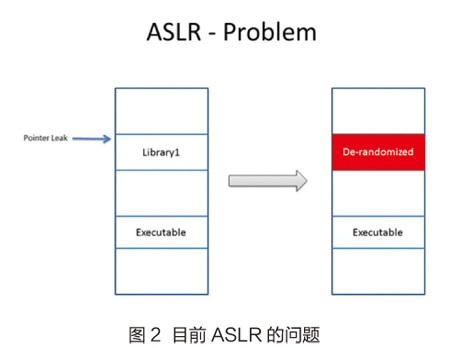在出现了某些漏洞,比如内存信息泄露的情况下,攻击者会得到部分内存信息,比如某些代码指针。传统的ASLR只能随机化整个segment,比如栈、堆、或者代码区。这时攻击者可以通过泄露的地址信息来推导别的信息,如另外一个函数的地址等。这样整个segment的地址都可以推导出来,进而得到更多信息,如图2所示,大大增加了攻击利用的成功率。在32位系统中,由于随机的熵值不高,攻击者也容易通过穷举法猜出地址。