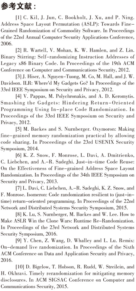 另一种方法[10]是用编译器来帮助定位要migrate的内存位置(指针),并且在每次有输出时进行动态随机化。该方法对于网络应用比如服务器,由于其是I/O-intensive的应用,可能会导致随机化间隔极短而性能开销巨大。(作者单位为Florida State University)