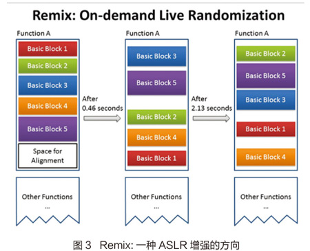 Remix[9]提出了一种在运行时细粒度随机化的方法。该方法以basic block为单位,经过一个随机的时间对进程(或kernel module)本身进行一次随机化,如图3所示。由于函数指针很难完全确认(比如被转换成数据,或者是union类型),该方法只能打乱函数内部的basic blocks。该方法的另一个好处是保留了代码块的局部性(locality),因为被打乱的basic blocks位置都靠得很近。打乱后,需要update 指令,以及指向basic block的指针,来让程序继续正确运行。假如需要增加更多的熵值,可以在basic blocks之间插入更多的NOP指令(或者别的garbage data)。