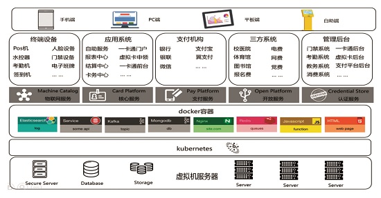 为此,我们建设了多个服务平台,包括统一支付平台、物联网平台、开放平台、人脸认证服务平台等,建立了统一的标准、协议和流程规范,实现在横向上业务互联互通、资源协调和信息共享;打造了全新的微服务一卡通系统平台,建设了统一的账户中心,实现了纵向上多元服务渗透;打造了多个特色应用服务系统,包括移动服务平台、校园缴费平台、运维管理平台等,同时将校园卡功能拓展至当地的城市公共交通(公交、地铁等)应用中。