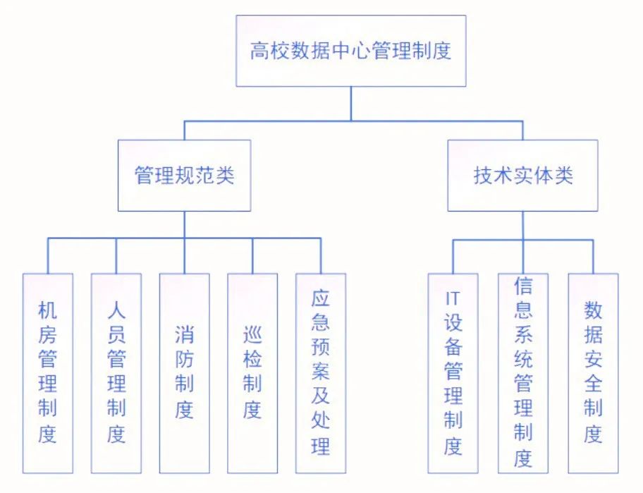 结合上述的高校数据中心运维体系和信息系统安全等级保护测评要求,数据中心管理制度可分为管理规范类和技术实体类(如图2所示)。