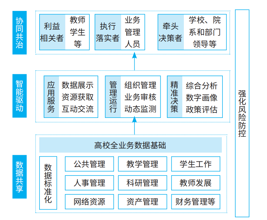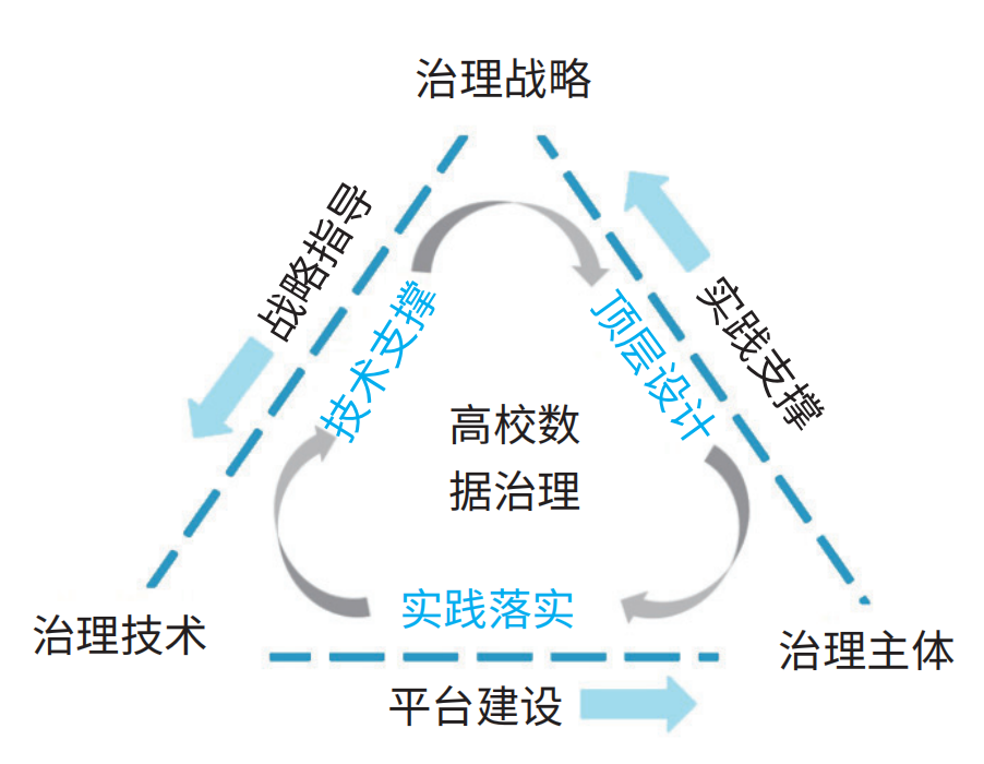 第一,强化数据标准,构建数据共享治理体系。从数据标准制定与数据管理着手,强化数据标准,增强数据汇聚融通,为高校治理提供数据共享基础。其一,制定数据标准,助力数据共享。应遵循唯一性、合理性、规范性等原则,参照国家、各省市的数据标准,通过实地调研、专家评估、讨论分析等多种手段,制定既与国家标准、行业标准相衔接,又符合高校内部实际的本土化数据标准,然后面向多维治理场景进一步建立统一的指标体系,为高校精准施策提供支撑。其二,加强统一管理,增强数据融通。应在统一数据标准的基础上,增强高校数据的统一管理与整合,包括数据存储、交换、应用等。在数据整合的基础上,基于高校多维应用场景,形成直接面向应用的集成化数据,提升数据赋能业务、数字治理的效能。